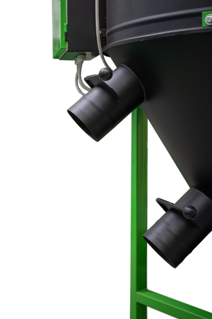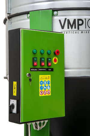 Zu den Komponenten des Mischers gehören eine Mühle, eine Förderschnecke, ein Zuschlagstoffbehälter und ein Lager. Die robusten Hämmer in der Mühle zerkleinern das Korn zuerst, es reist entlang der Schneckenförderung unter die Zuschlagsabweiserin, in die Sie Vitamine und Mineralstoffzusätze füllen können.Das gesamte Material wird von der Schnecke zum Speicher gefördert, wo durch Anheben des Materials vom Boden bis zur Spitze alles gemischt wird. Der Mischer wird manuell entleert. Das gesamte System wird von drei starken Motoren angetrieben (Mühle, Transporter und Lager), die Sie mit Schaltern am elektrischen Schrank bedienen. Das Korn und die Zusätze werden manuell dosiert.