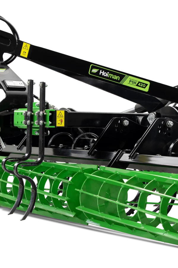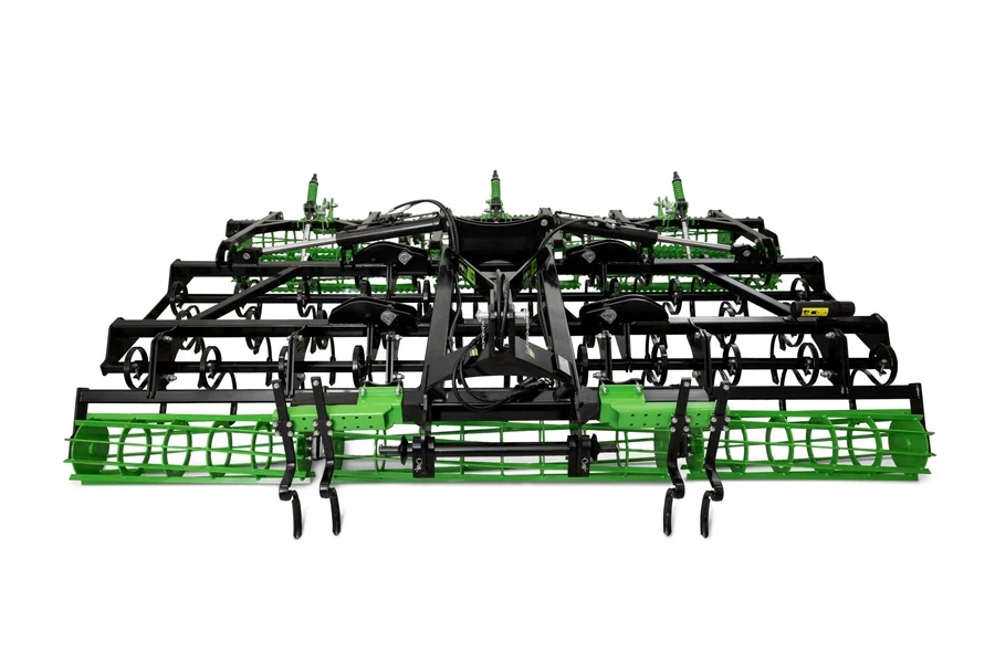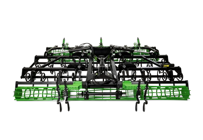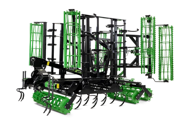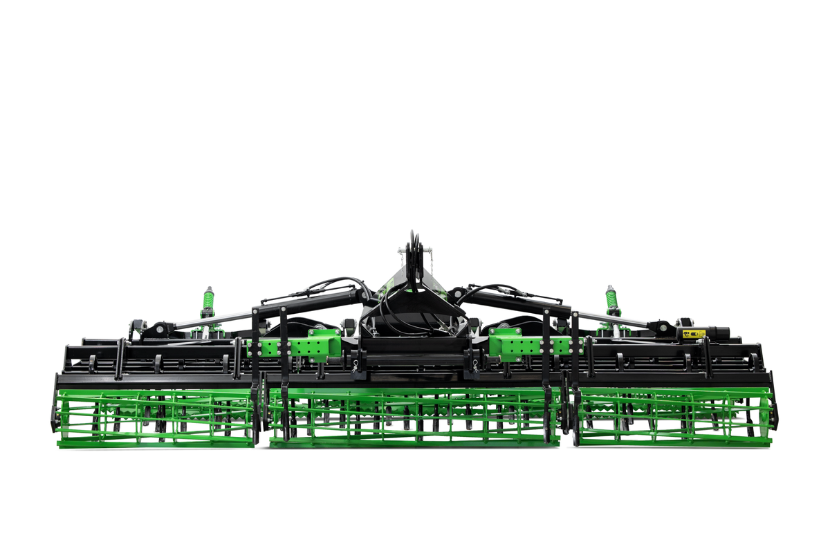 The pre-sowing cultivator HOFMAN MORO AUH, from 3.6 to 5.6 meters in width, offers a compact and easily maneuverable machine. It makes sense to use such a cultivator especially on heavy soils. Due to its width, the external units of the pre-sowing cultivator are hydraulically foldable for transport and storage needs. The MORO AUH cultivator consists of a front roller, four rows of loosening tines, and two rear spiky rollers.